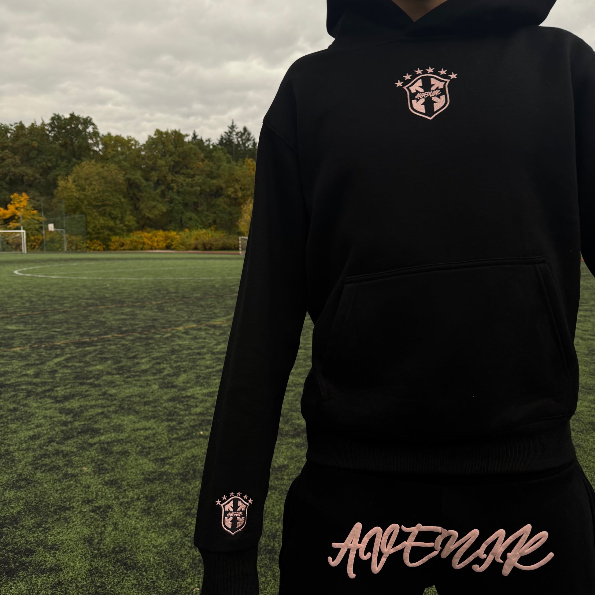 Slip into the Midnight Rosa hoodie, a black and pink cotton sweatshirt that wraps you in warmth, comfort, and confidence.